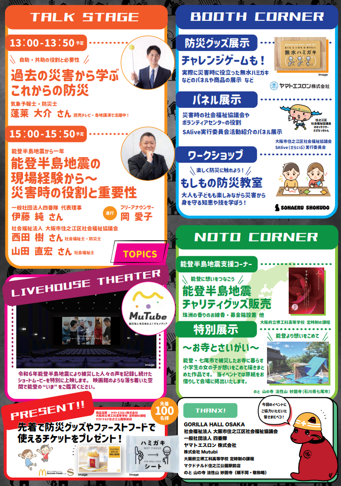 当社のブースでは「災害時のオーラルケア」をテーマに無水ハミガキの展示や、ハブラシ100gチャレンジゲームを行います。イベントでは気象予報士の蓬莱大介さんのトークライブや、先着で防災グッズのプレゼントもあります。