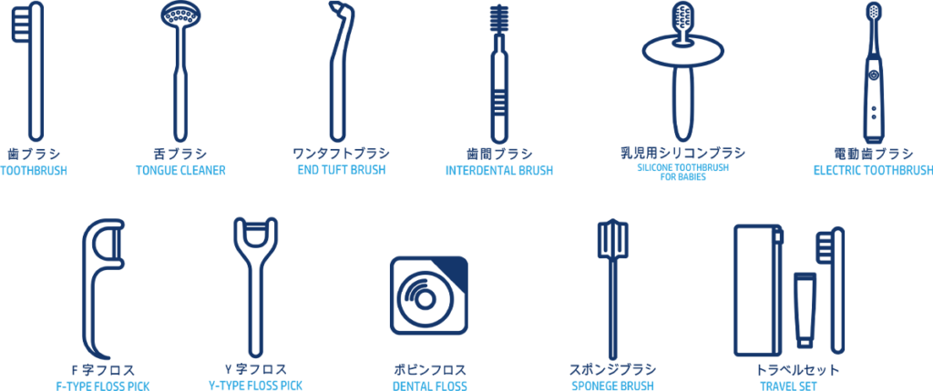 - 歯ブラシ(乳児用歯ブラシ、子供用歯ブラシ、大人用歯ブラシ、電動歯ブラシ等)