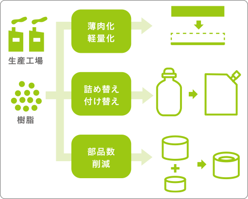 樹脂量を減らす工夫として薄肉化、軽量化、部品点数減などを取り組んでいます。